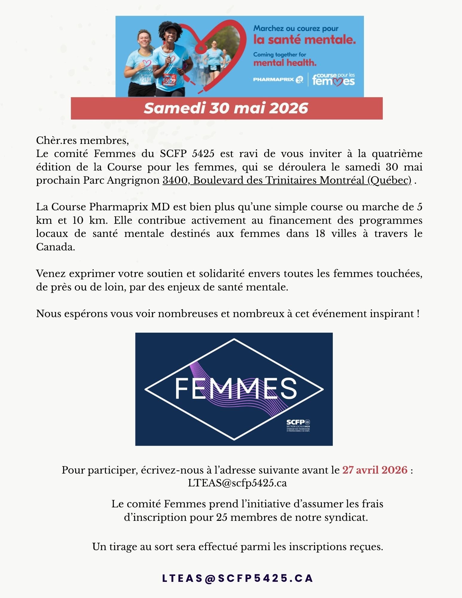 Activités Course pour les femmes Pharmaprix 2026 Signalez votre intérêt avant le 27 avril prochain au lteas@scfp5425.ca